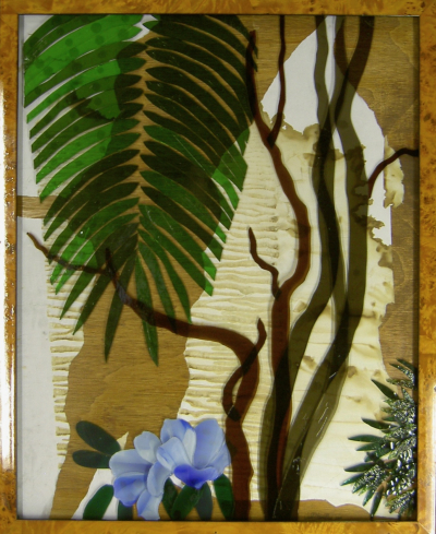 Refining a long tradition of collage, with a nod to Victorian Shadow Boxes, these works explore the design concepts of Ikebana using glass as bas-relief sculpture. I utilize `found frames' to make these works but their parameters are broad, sometimes utilizing cardboard boxes, sometimes incorporating found object as well as glass and employing various backgrounds such as timber and, most recently, drawing and photo-montage. While they adhere to all the principals of design these works (like many of my artworks) are playful; they do not take themselves too seriously.